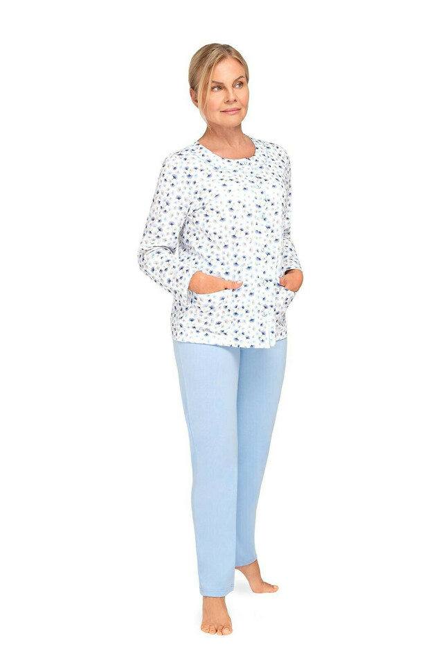 Dámské bavlněné pyžamo. Vzorovaná blůza pyžama má dlouhé rukávy, kulatý výstřih a rozepíná se. Zobrazit více